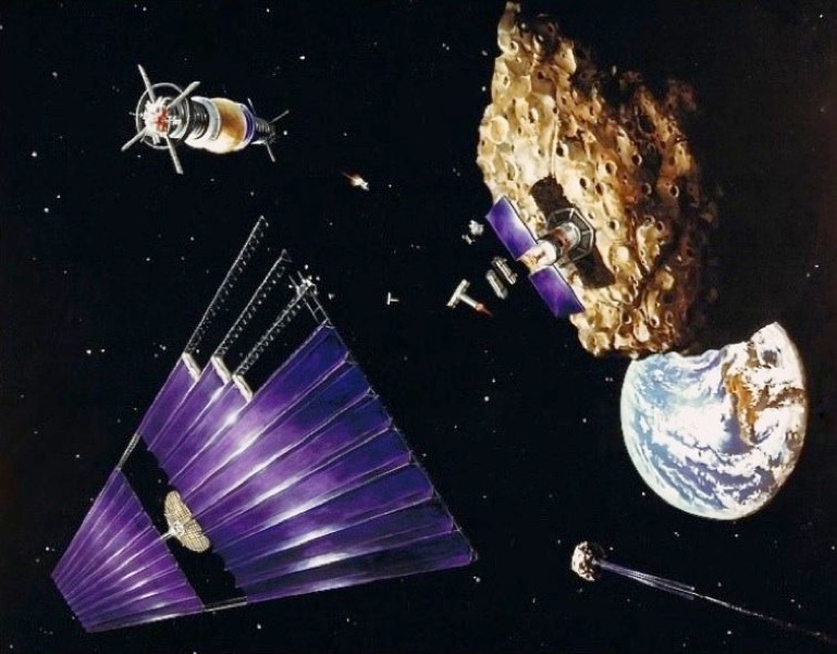 An asteroid moved by a mass driver to L5 orbit and mined for materials used to construct a solar power satellite.